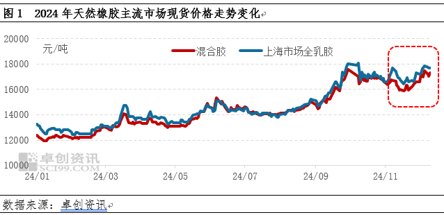 【导语】11月下旬以来,天然橡胶市场价格未能延续中旬以来的下跌走势,而是呈现震荡走高表现,首先在于泰国南部连续降雨导致多地淹水,引发市场对于旺产季供应受损担忧;同时国内季节性累库周期下国内现货库存增长相对缓慢,加重了供应偏紧预期。但周内,市场消息频出叠加宏观情绪降温,胶价重心宽幅震荡。后市,胶价或区间宽幅震荡,核心驱动仍在供应端。