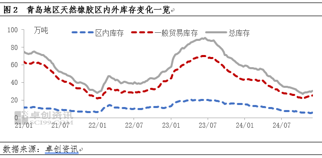 从正常季节性来看,四季度伴随海外进入旺产季,国内需求进入消费淡季,供需矛盾下国内现货库存将呈现累库表现。但国内整个累库节奏相对缓慢,且从主要进口港口青岛地区天然橡胶库存表现来看,虽然前期国储局抛储的部分货源进入青岛一般贸易仓库,但并没有趋势性累库。且国内现货低库存局面延续,导致市场对供应端的利多更加敏感,支撑胶价重心偏强运行。