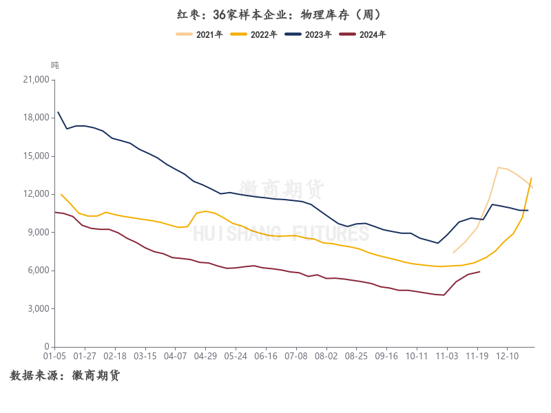 截至11.28日,36家样本点物理库存6995吨,较上月增加2831吨,环比增加68.64%,同比减少37.90%,样本点库存增幅明显,新产季灰枣采购推迟展开,自上周六开始兵团第三师收购进展加快,企业及客商挑选好货积极收购,因受地方政策影响内地中小客商收购体量有限,关注产区采购进展及货权转移进度。2023年虽然减产,但是收购高价红枣之后客商走货不及预期,今年结转库存也比较多,吸取2023年经验和充分认识到市场变化后,客商收购更加谨慎。