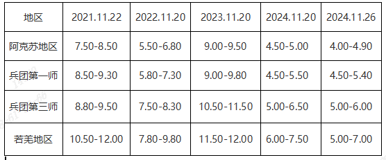 产区收购从边缘产区皮山、若羌、且末地区展开,初期高价在8.50-10.00元/公斤,企业及客商挑选好货适当性采购,随着收购的进行枣农多顺价出货,收购尾声价格围绕5.00-7.00元/公斤,随后主产区阿克苏价格从初期的6.50-7.00元/公斤回落至4.00-4.90元/公斤后企稳;兵团第一师价格从初期的6.50-8.00元/公斤回落至4.20-5.40元/公斤;喀什地区下树开秤时间较晚,开秤价格在5.80-6.20元/公斤,随着兵团第三师地方政策(交保证金、原料本地加工等)管控的放松,按正常年份来看,70%仓单出自喀什产区(质量高于阿克苏、兵团第一师),企业及客商采购积极性提高,5.00-6.00元/公斤收购质量不错的货源。产区采购进程加快,价格止跌企稳,目前采购量约为总产量的1/3左右,由于质量参差不齐价格两极分化明显,一般货出成率较低,后期一般货大概率仍有下跌可能。
