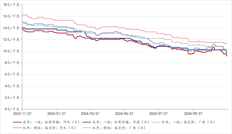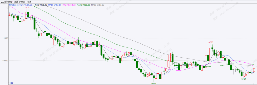红枣主力合约由11月初10570元/吨下跌至9495元/吨,下跌1075元/吨。