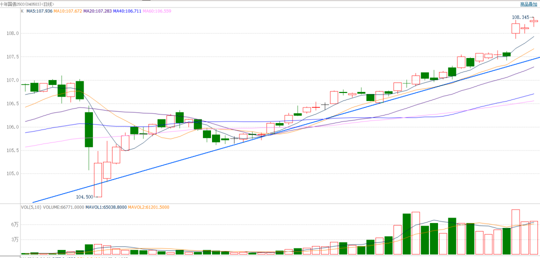 截至前一个交易日收盘,国债高开高走,收小阳线。日k线整体仍延续强势,沿着10日均线震荡上行。