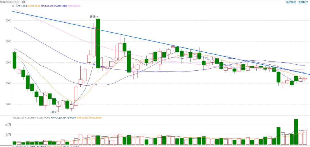 截至前一个交易日收盘,纯碱底部盘整,收小阳线。日k线整体震荡下行,价格重心逐步下移。