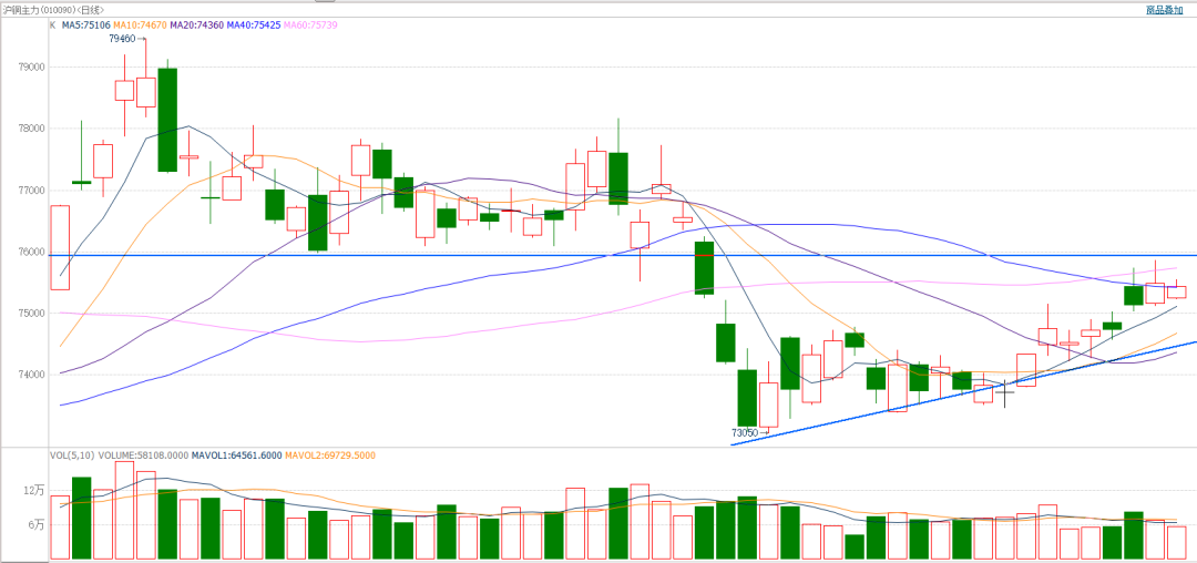 截至前一个交易日收盘,沪铜低开高走,收小阳线。日k线震荡上行,74000附近存在一定支撑。