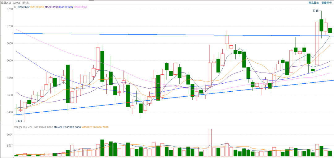 截至前一个交易日收盘,鸡蛋高位盘整,收小阴线。日k线底部反弹,向上突破前高压力。
