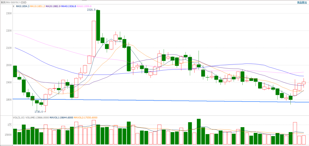 截至前一个交易日收盘,焦炭震荡上行,收小阳线。日k线底部反弹,1800附近存在较强支撑。