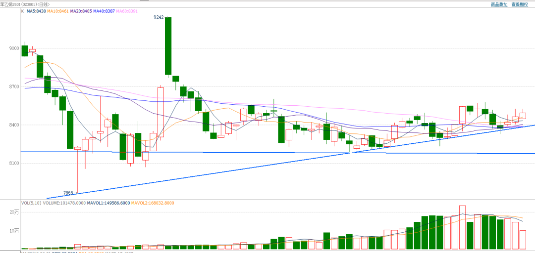 截至前一个交易日收盘,苯乙烯低开高走,收小阳线。日k线底部反弹,60日均线附近存在一定支撑。