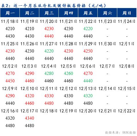 截止2024年12月17日17:30,冷轧板卷月均价为4267元/吨,镀锌板卷月均价为4452元/吨。