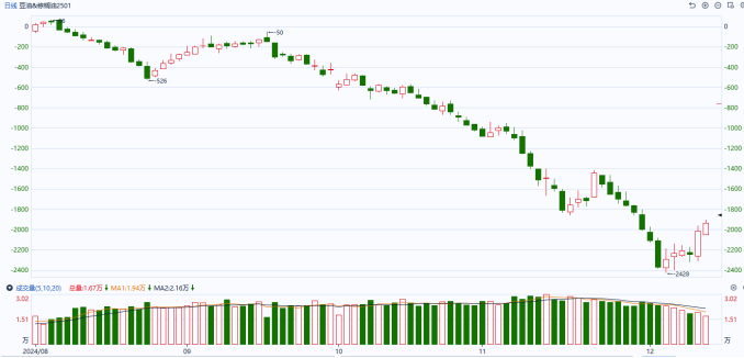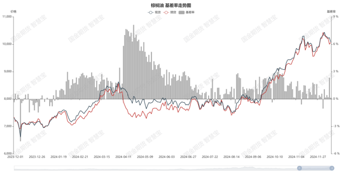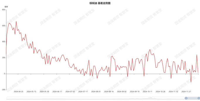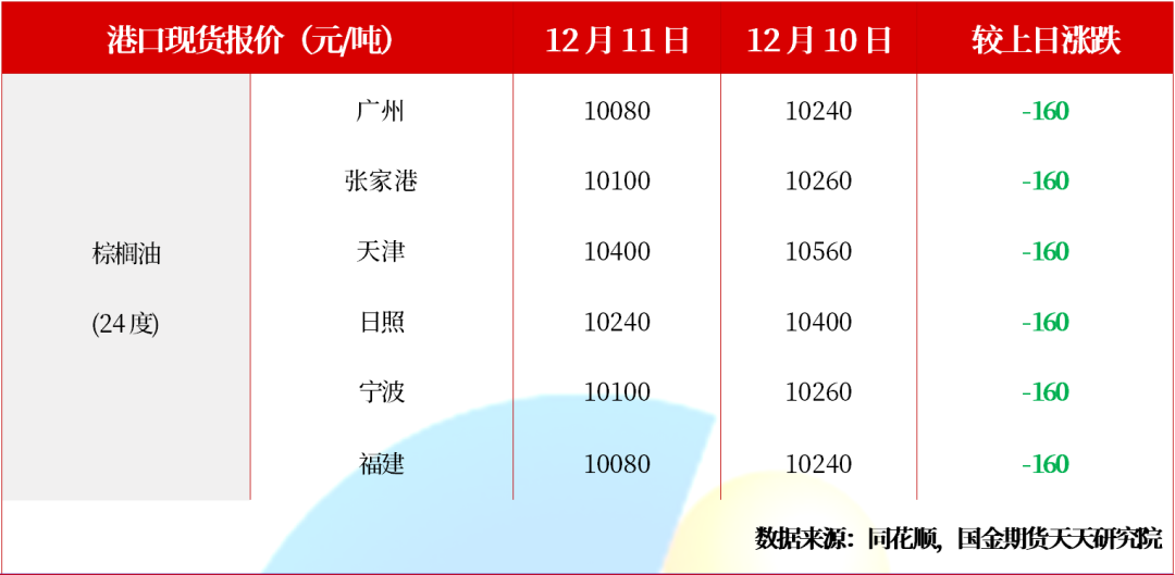12月11日,各重点港口现货报价10080-10400元/吨,较上一交易日跌160元/吨;现货均价与期货P2501基差+14元/吨,较上一交易日缩小226元/吨。
