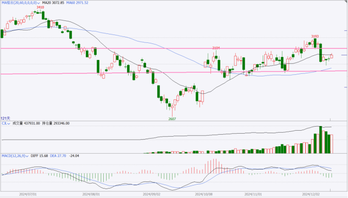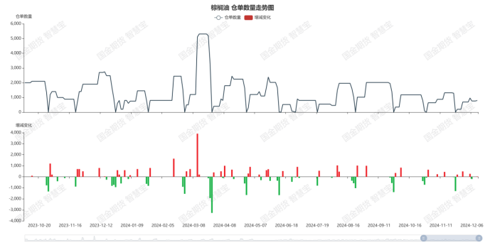棕榈油主力合约移仓换月中,近月P2501合约逐渐回归交割逻辑,价格靠近现货,远月P2505合约因目前国内到港船运较少,下游市场刚需采购,库存延续减少走势,短期看价格或仍呈现高位震荡走势。