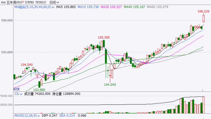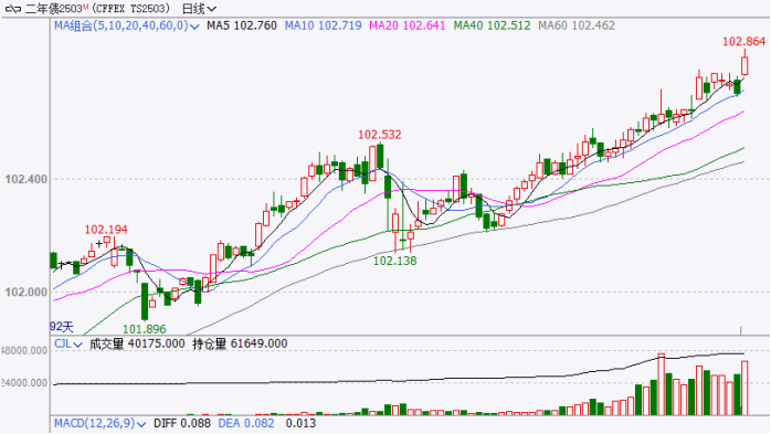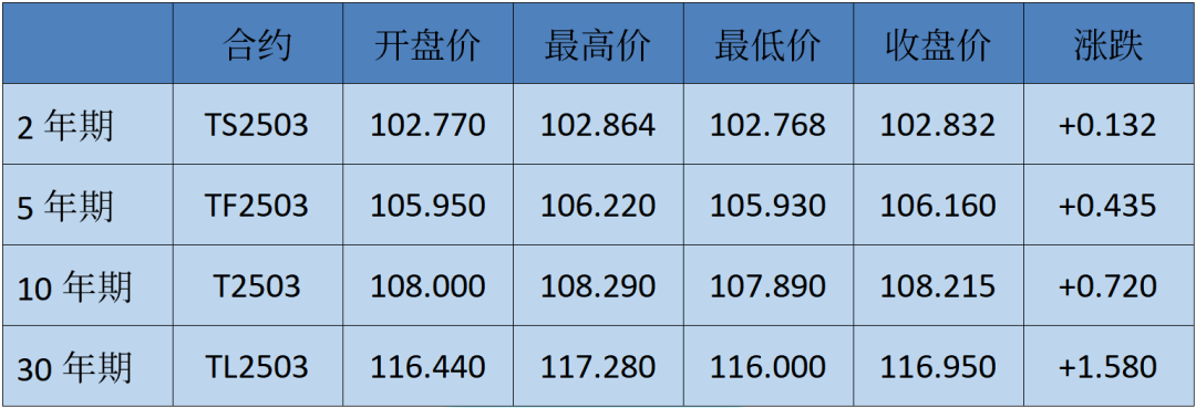 12月10日,国债期货,TS2503+0.13%收至102.832,TF2503+0.41%收至106.160,T2503+0.67%收至108.215,TL2503+1.37%收至116.950。