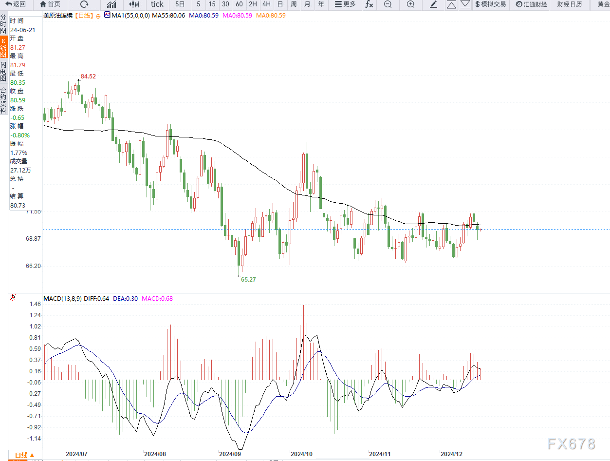 技术层面上来看,美原油日线重回中枢区间之内,依然未能突破箱体压力,且围绕均线反复震荡,昨日回踩支撑之后MACD多头动能略有不足,等待方向选择为主,重点留意70美元整数关是否突破。