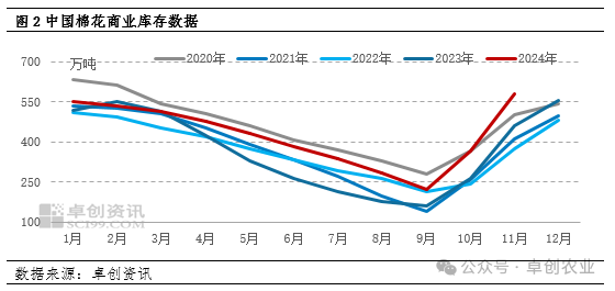 棉花丰产预期增强。新疆棉花采摘全面结束,籽棉交售也进入尾期,总体来看,今年棉花采收进度快于去年同期。截至2024年12月16日,新疆地区皮棉累计加工总量为530万吨,同比增幅为19.4%;新疆棉花公检量达475.64万吨,同比增幅16.8%。当前日度加工量维持在5万吨以上。因此卓创资讯预估,2024年全国棉花增产幅度大于之前预期,2024/25年度全国棉花产量预期将达到632万吨,同比增加60.5万吨,增幅10.59%。棉花丰产预期增强,供应压力增大,利空棉价,另外12月至明年1月仍处于集中加工上市期,对价格或形成利空驱动。