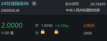 国债期货午后跳水,30年期主力合约跌1.13%,早盘一度涨0.39%;10年期主力合约跌0.15%;5年期主力合约跌0.07%。与此同时,银行间现券长端收益率加速上行,7年及10年期国债活跃券上行2-3bp,7年期“24附息国债18”报1.65%,10年期“24附息国债11”报1.74%,30年期国债活跃券“24特别国债06”收益率上行幅度扩大至4.1bp,重返2%。