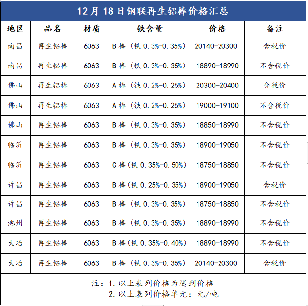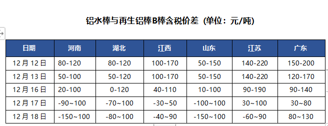 12月18日A00铝锭现货价华东19790,跌110;华南19950,跌60;中原19690,跌90(单位:元/吨)。 铝价持回落,再生棒厂积极出货为主,今日再生铝棒价格下跌100元/吨。