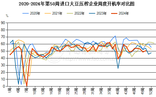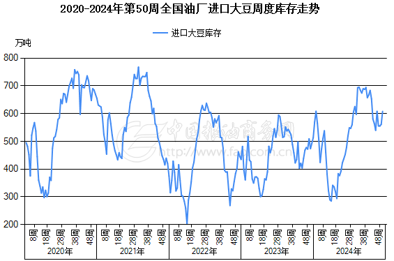 (2)近三个月国内大量进口了大豆及油菜籽,导致大豆库存出现累积,环比库存数据重新走高。粮油商务网监测数据显示,截止到2024年第50周末,国内进口大豆库存总量为608.2万吨,较上周的561.3万吨增加46.9万吨,去年同期为473.9万吨。