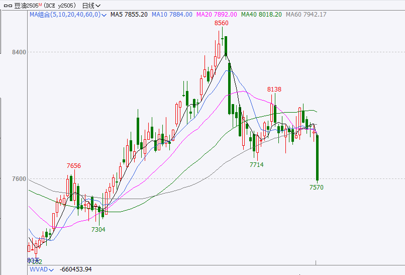 受进口大豆港口库存集中,年前去库压力大的影响,今日国内豆油期货2505合约大幅下跌,截至收盘报7590元/吨,跌幅达到3.75%,跌296元/吨。