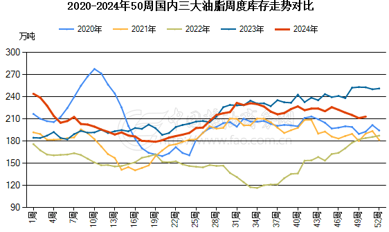 (3)因临近传统的春节假期,国内采购下滑,导致油脂去库减缓。粮油商务网监测数据显示,截止到2024年第50周末,国内三大食用油库存总量为213.13万吨,周度增加1.99万吨,环比增加0.94%。