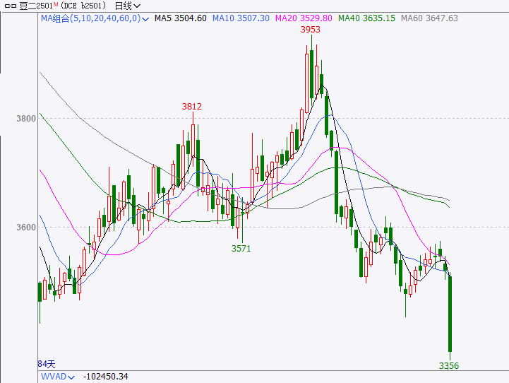 受进口大豆港口库存集中,年前去库压力大的影响,今日国内豆二期货2501合约大幅下跌,截至收盘报3371元/吨,跌幅达到4.37%,跌154元/吨。