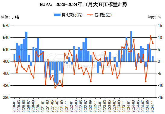 (1)国际市场方面,美国压榨需求开始下滑,导致美豆走低,进而拖累国内油料的表现。美国油籽加工商协会NOPA最新的报告显示,11月美国会员单位共压榨大豆525.77万吨;10月为544.21万吨,环比下降3.39%。
