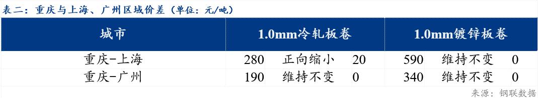 重庆、上海地区冷轧板卷区域价差缩小20元/吨;重庆、广州冷轧板卷区域价差维持不变。重庆、上海镀锌板卷区域价差维持不变;重庆、广州镀锌板卷区域价差维持不变。镀锌、冷轧品种价差反向缩小20元/吨;镀锌、热轧品种价差维持不变;冷轧、热轧品种价差缩小20元/吨。