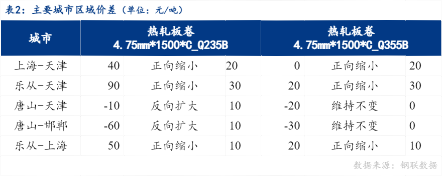 从区域价差来看,4.75mm普卷华南与华北价差90元/吨,华东与华北价差40元/吨 ,华南与华东价差50元/吨。京津冀地区价差来看,唐山与天津价差-10元/吨,唐山与邯郸价差-60元/吨。