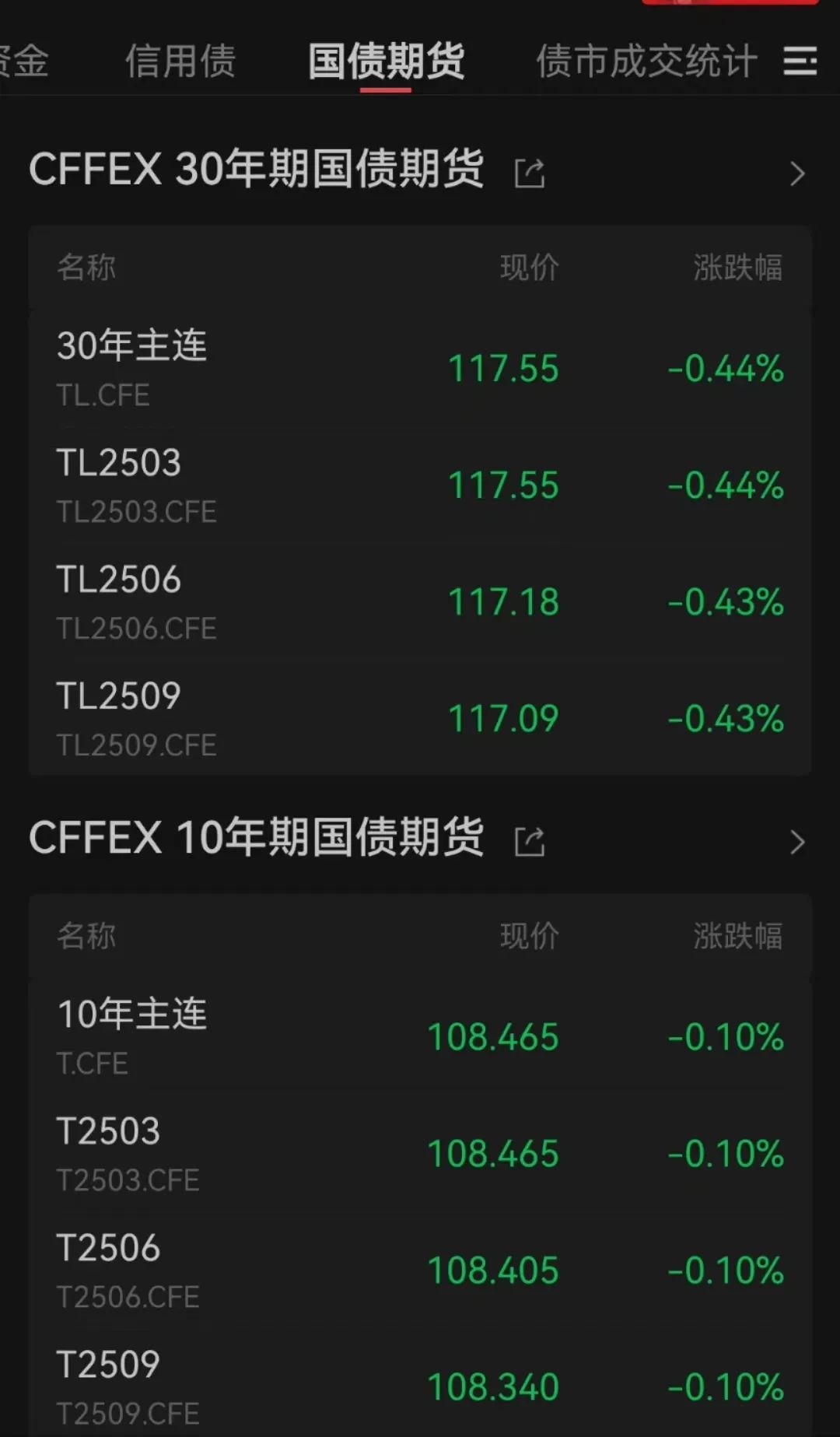 数据显示,国债期货午后下跌,收盘多数下跌,30年期主力合约跌0.44%,盘中一度跌1.75%;10年期主力合约跌0.1%,5年期主力合约跌0.02%,2年期主力合约持平。