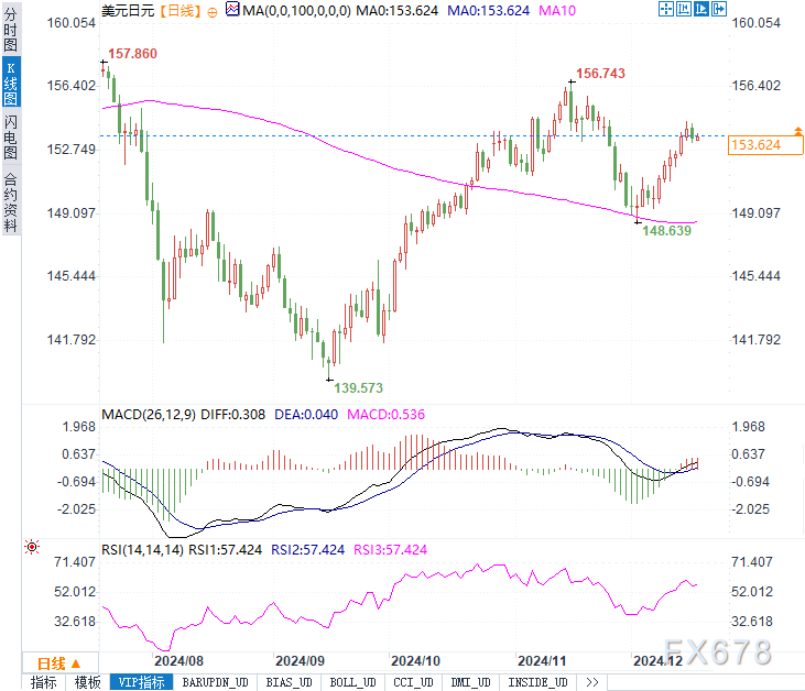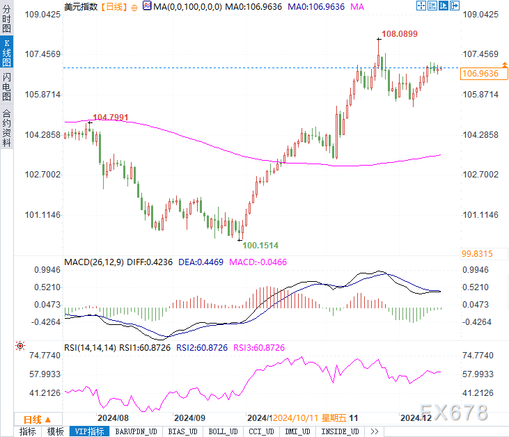 美元指数今日小幅上涨至106.98,维持在11月26日以来的最高点附近。市场已经基本消化了美联储此次降息25个基点的预期,焦点转向美联储对于2025年降息步伐的预测。如果点阵图显示美联储将更为谨慎,仅进行少量降息,美元可能会维持强势,进一步加大对其他货币的压力。