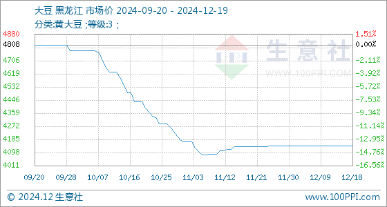 12月19日,生意社大豆基准价为4144.00元/吨,与本月初(4140.00元/吨)相比,上涨了0.10%。