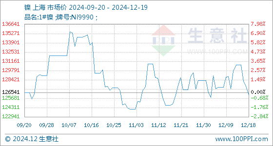 12月19日,生意社镍基准价为126158.33元/吨,与本月初(128300.00元/吨)相比,下降了-1.67%。
