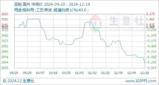12月19日,生意社豆粕基准价为2858.00元/吨,与本月初(3024.00元/吨)相比,下降了-5.49%。