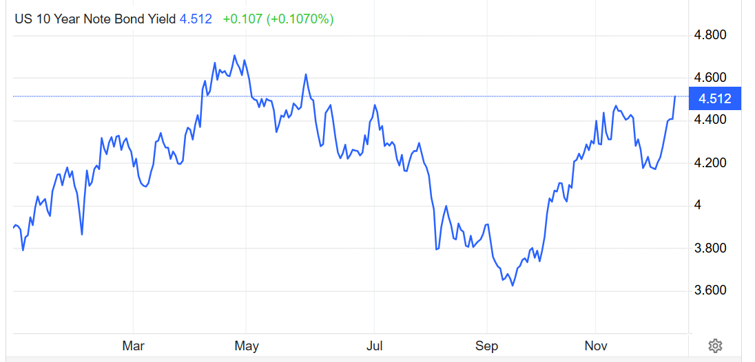 美联储所设定的政策利率是国债收益率的关键影响因素,自9月以来,交易员们对进一步降息的预期逐渐减弱,推动10年期美债收益率回升至4%以上,达到至少自7月以来的最高水平。被视作无风险收益率基准的10年期美债收益率仍然徘徊在4.5%上方,自9月中旬以来已上涨超过85个基点,给那些在较低收益率水平买入的投资者带来了损失。