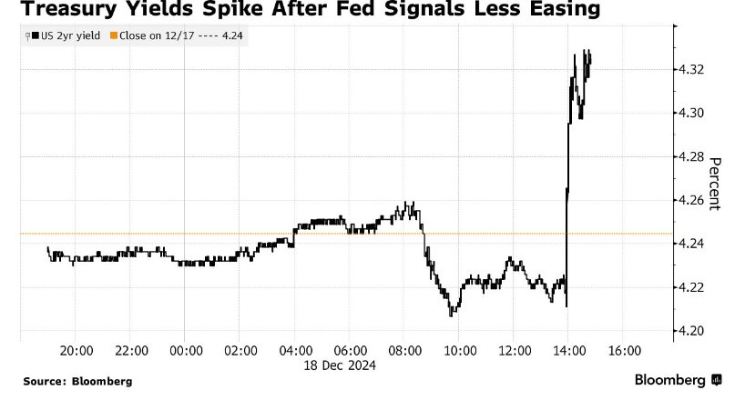 美联储利率决议如市场所预期的那样上演“鹰派降息”剧本后,美联储预期管理正式步入新阶段,即正处于或接近放缓降息的时刻,并且万众瞩目的“利率点阵图”显示美联储官员们普遍预计2025年仅仅降息两次,低于9月显示的降息四次的基本预期,长期联邦基金利率中值则上调至3%。在鹰味十足的政策声明以及鲍威尔发表鹰派讲话之后,美国国债市场暴跌,各期限美债收益率飙升,10年期美债收益率突破4.5%,美元指数一跃至2022年以来最高点,交易员们将美联储修订后的预测视为市场大幅下调明年降息预期的核心理由。