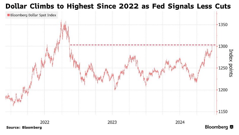 在美联储暗示明年货币宽松步伐将大幅放缓后,美元指数反弹至两年多来的最高水平。“彭博美元现货指数”美东时间周三大涨1%,为2022年以来的最高水平。这一激增导致其他的主权货币汇率大幅下跌,在当天,欧元、英镑和瑞士法郎兑美元均下跌超1%。