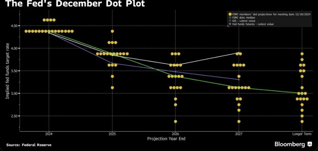 来摩根大通资产管理部门的投资组合经理普里亚米斯拉在鲍威尔讲话后表示:“这是绝对是鹰派风格的美联储降息。”美联储的预测显示,官员们现在普遍预计明年将仅仅降息两次,每次25个基点,美联储甚至让交易员们有理由看到2025年仅仅降息一次——掉期市场交易员预计的降息次数甚至更少,他们押注2025年仅仅降息一次。
