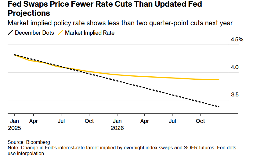 美联储掉期定价预示的降息次数少于美联储最新预测——市场隐含政策利率表明,明年降息幅度将不足两次