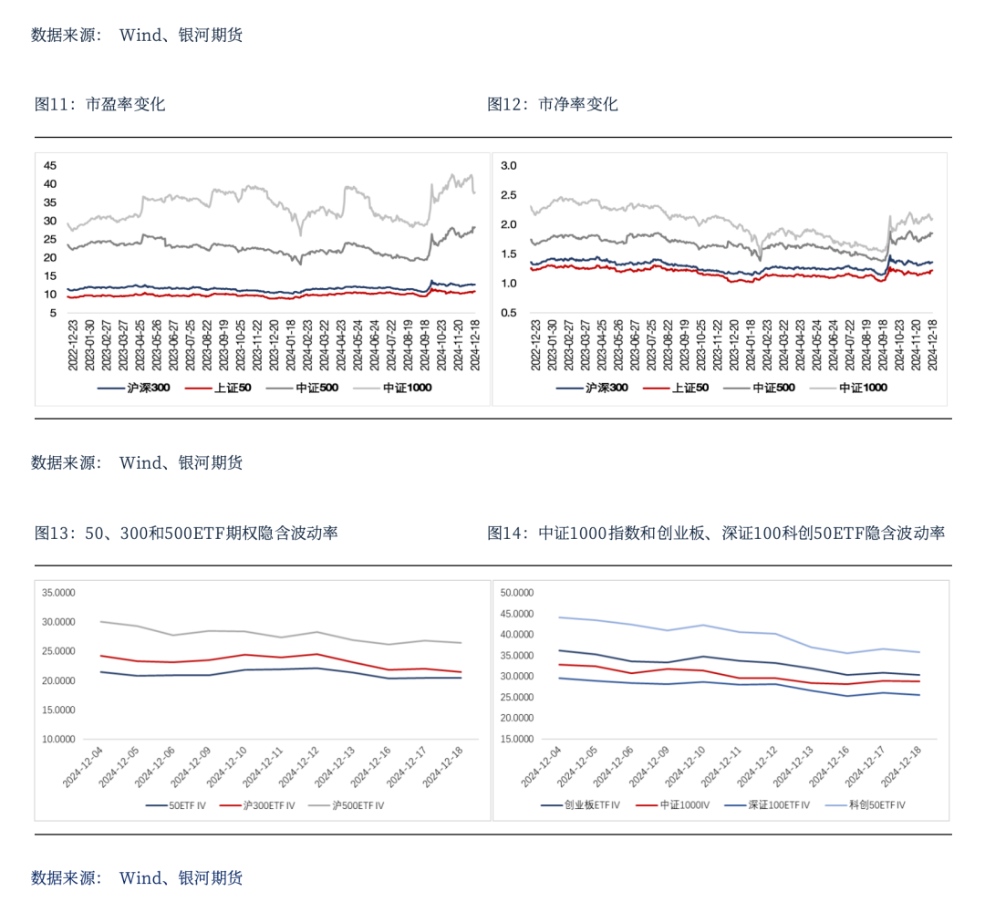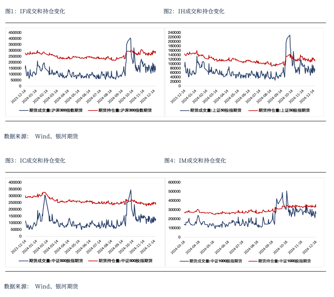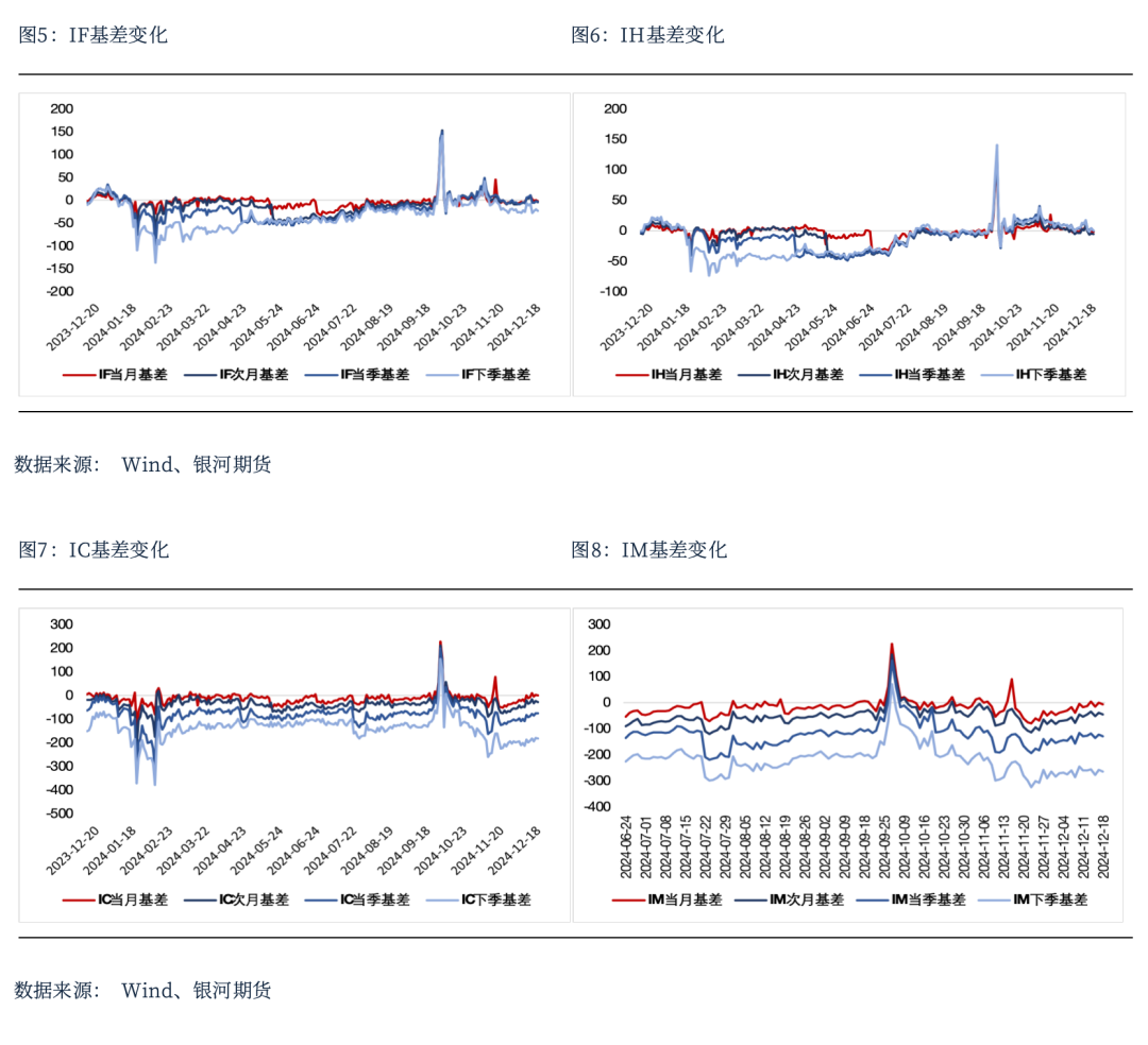 股指期货随现货反弹,至收盘,主力合约IH2412涨0.61%,IF2412涨0.3%,IC2412涨0.56%,IM2412涨0.61%。期货表现弱于现货,各品种基差小幅下行。IC、IF、IH和IM成交分别下降8.9%、19.7%、8.2%和8.3%,持仓分别下降5.4%、6%、3.9%和6.5%。