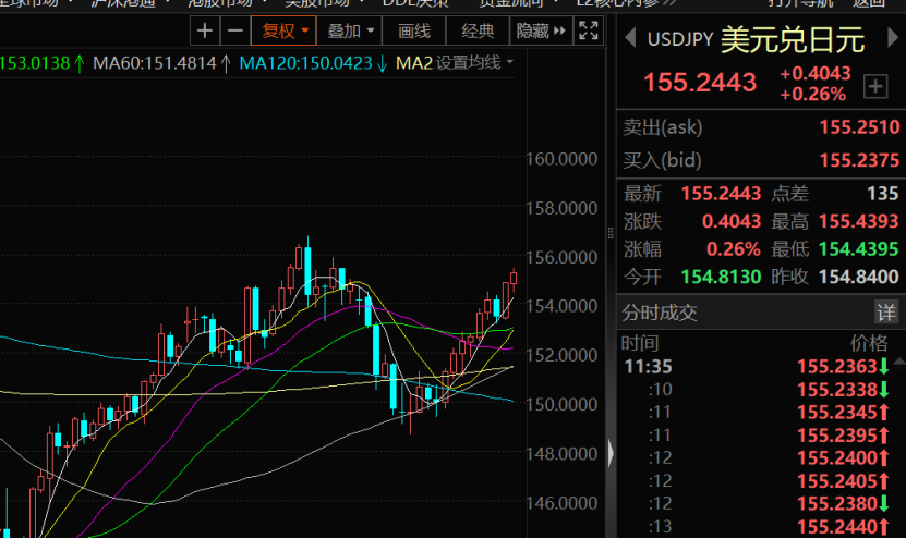 今天早盘,日元再度成为市场的焦点。美元兑日元在昨日夜盘大涨之后,今天上午十点半过后,再度飙升。日元走低约80点,一度报155.43。而且,从近期的趋势来看,美元兑日元处于一个上升趋势当中,这也意味着日元在持续走弱。