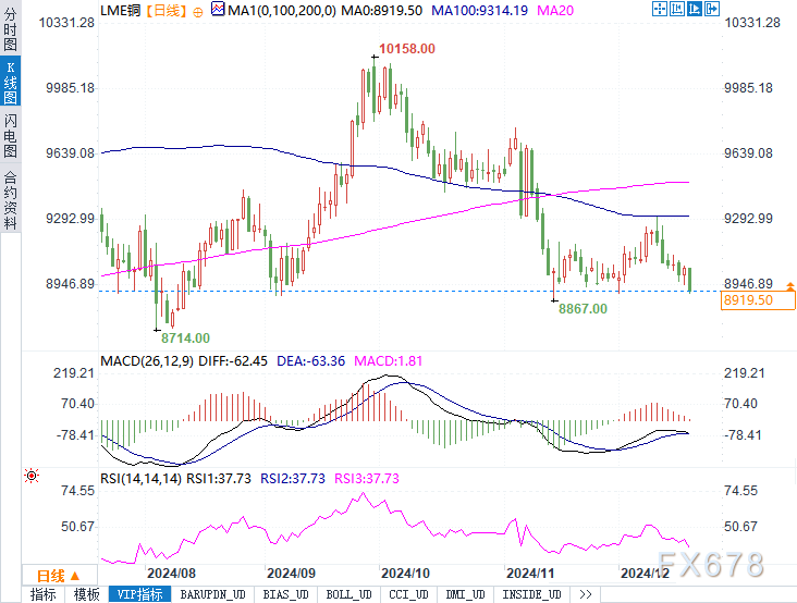 从LME铜的技术走势来看,当前铜价在8,900美元附近徘徊,并未出现突破性的上涨迹象。短期内,铜价可能面临一定的下行压力,尤其是在美元继续走强的背景下。技术指标上,铜价已经从近期的高点回落,且在短期内未能有效突破关键阻力位。若铜价未能站稳8,900美元支撑位,可能会进一步下探8,800美元附近的低点。