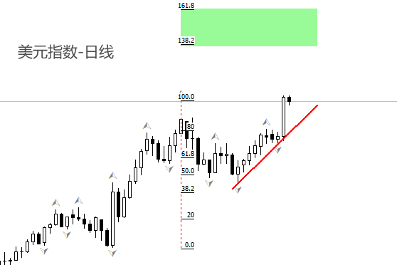 经过昨日的大涨之后,美元指数已经突破11月份高点108.08,新一轮上涨走势已经开启。12月6日至今的上涨波段能够持续多久,成为技术派研判的焦点问题。黄金分割角度看,最新一轮上涨走势应当占前一轮上涨走势的1.382~1.618之间,这样才是良性的扩张形态。如果扩张力度超预期,最新波段的最高价可能超过1.618并向2.0倍移动;如果扩张力度低于预期,最高价将低于1.382倍。中性角度看,本轮上涨波段最高价结余1.382~1.618之间(市价为109.8~111.0)的概率较高。由于美元指数109上方的报价已经处于极高水平,可能需要消息面的配合才能做到。