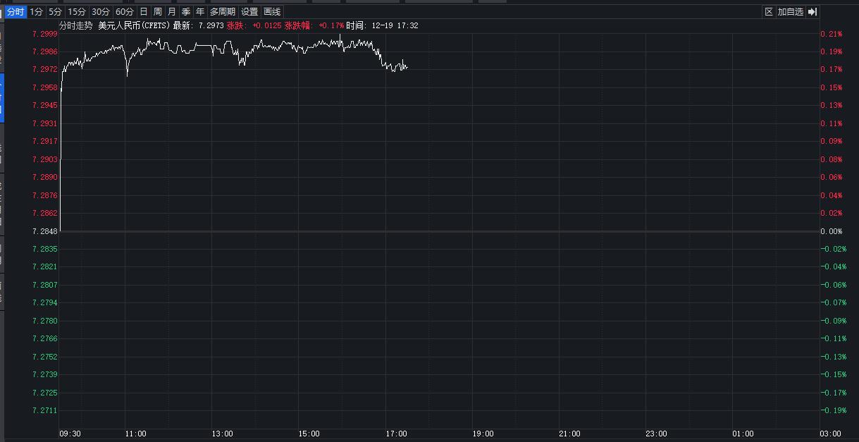 截至12月19日17时,在岸人民币兑美元汇率日内牢牢守住“7.30”关口