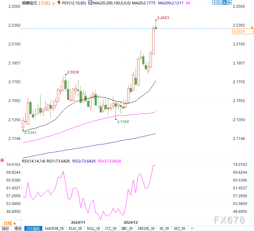 日线图显示,相对强弱指数(RSI)超过70,英镑/纽元的涨势已进入超买区域。技术规则表明,RSI高于70为超买状态,但分析师认为,RSI未来可能回归至70以下;这可能需要英镑的回调或汇率的盘整,虽然这并不表明趋势会立即发生变化,但还是针对涨势将减弱发出警示信号。