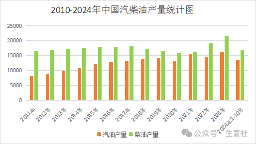 供应面:中国已成为世界第一大炼油国家,原油总加工能力约10亿吨/年。2024年成品油产量同比涨跌不一,截止10月,汽油总产量为13567.7万吨,同比增加2.6%;柴油总产量为16829.3万吨,同比减少4.7%。近几年中国汽、柴油产量统计如下: