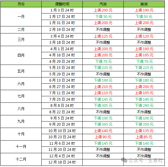 2024年全年国内成品油零售价调整情况: