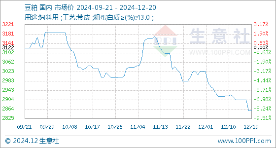 12月20日,生意社豆粕基准价为2858.00元/吨,与本月初(3024.00元/吨)相比,下降了-5.49%。