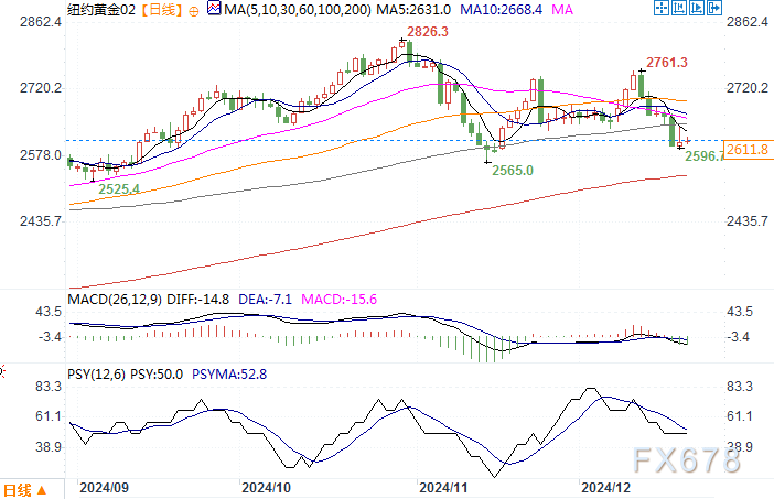 这一声明在美国金融市场引发了广泛影响。随着股市暴跌,金价大幅下跌超过每盎司60美元。最活跃的2月黄金合约开盘报2663.30美元,收于2599.6美元,此前每盎司下跌63.90美元。周四的交易显示出温和的复苏,黄金开盘为2600.60美元,收盘为2610美元,净上涨10.40美元,涨幅为0.40%。