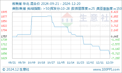 据生意社商品分析系统显示,本周炼焦煤市场继续下跌。截至到12月20日,炼焦煤市场均价为1652.25元/吨,较月初下降-3.64%。