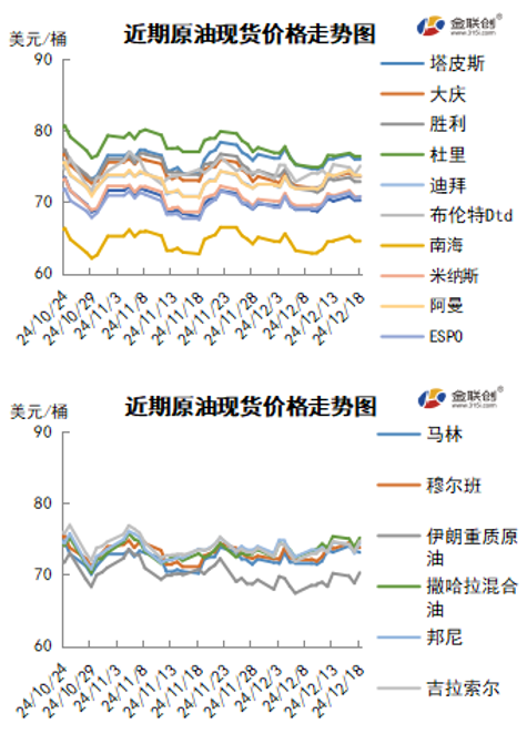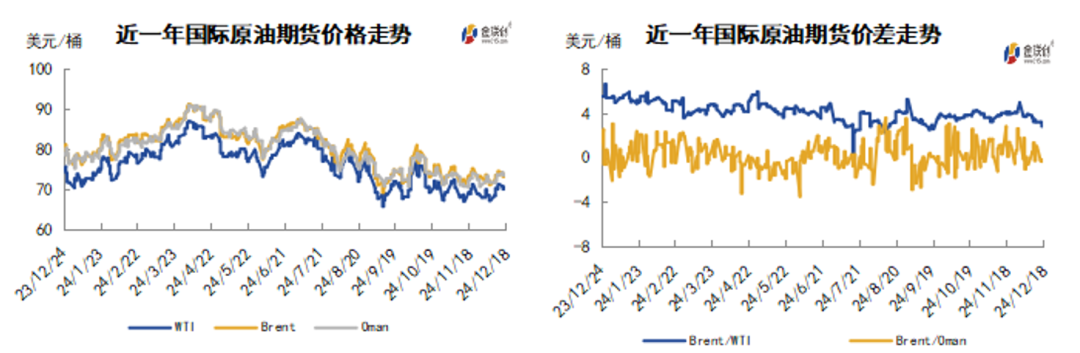 周内,市场消息面喜忧参半。一方面,中东地缘局势不确定性增加利好油价。以色列军方官员表示,随着伊朗在中东的代理团体实力减弱以及叙利亚阿萨德政权下台,以色列空军正在做好继续对伊朗核设施可能发动袭击的准备。此外,美国原油库存减少也提振国际油价上涨。美国能源信息署(EIA)公布的库存报告显示,截至12月13日当周,美国商业原油库存较一周前减少93.4万桶至4.2102亿桶。美国原油库存总量较一周前减少41.5万桶至8.14066亿桶。