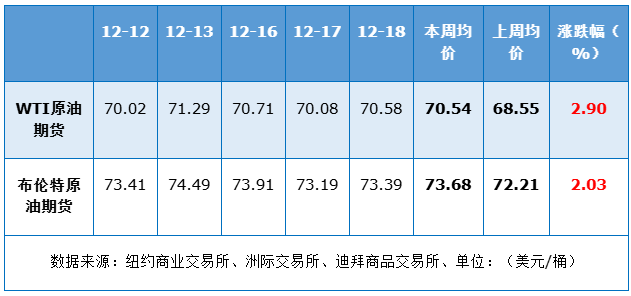 导言:本周(12.12-12.18),原油整体呈现区间震荡的走势。WTI本周均价70.54美元/桶,较前一周上涨1.99美元/桶,或2.90%。周内,对油价起到支撑的因素有:中东地缘局势仍存不确定性以及美国原油库存减少。另一方面,市场机构预期原油市场供过于求,投资者对供应过剩的担忧的担忧限制了油价的上涨空间。