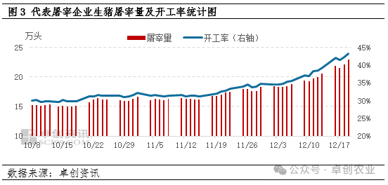 随着气温继续下降,南方腌腊进入高峰期,且进入月中旬,随着冬至临近,下游备货积极性提升,屠宰企业订单显著增加,支撑12月份生猪屠宰量环比增幅明显。截至19日,全国代表屠宰企业生猪屠宰量增至月内最高的22.97万头,较11月末涨幅25.65%,12月全国代表屠宰企业日均生猪屠宰量为19.99万头,环比涨幅18.64%,需求增幅同样明显。